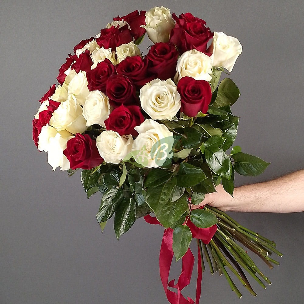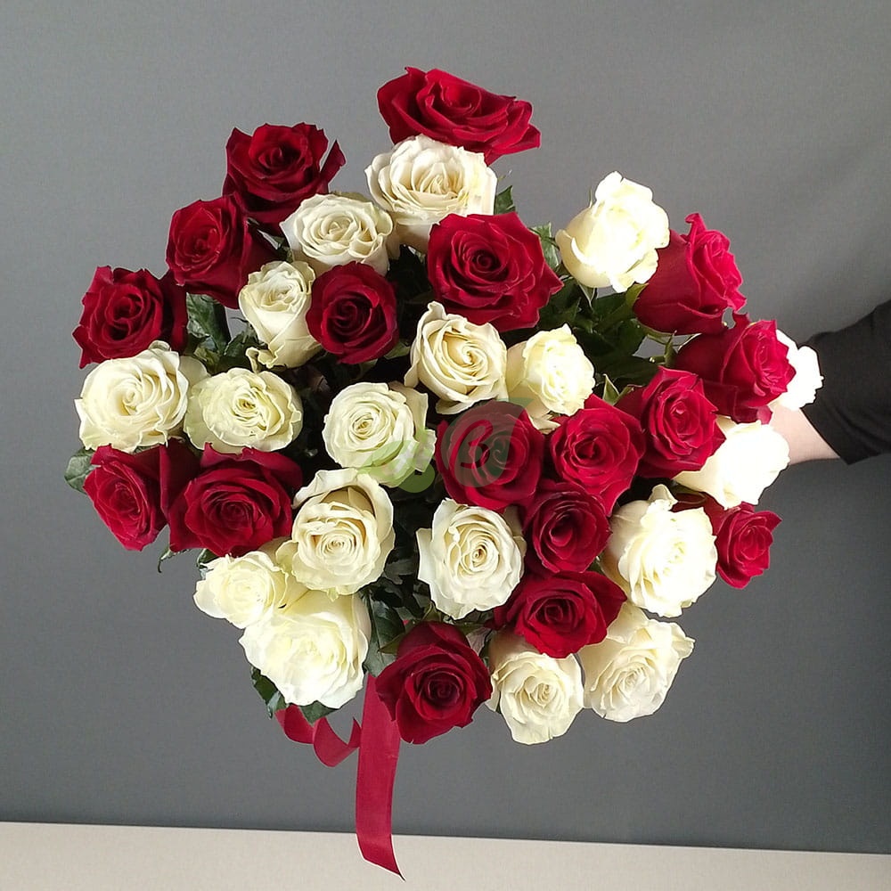 Состав и характеристики букета 25 красных и белых роз "Эквадор":