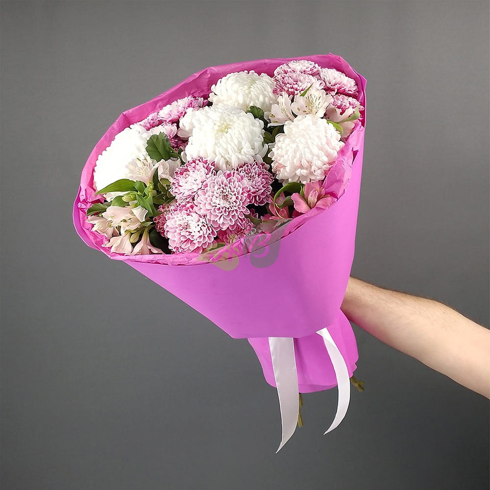 Шикарный букет – это сочетание альстромерии и восхитительных хризантем в одной композиции. Эти цветы можно заказать для модницы, ведь он довольно необычен.