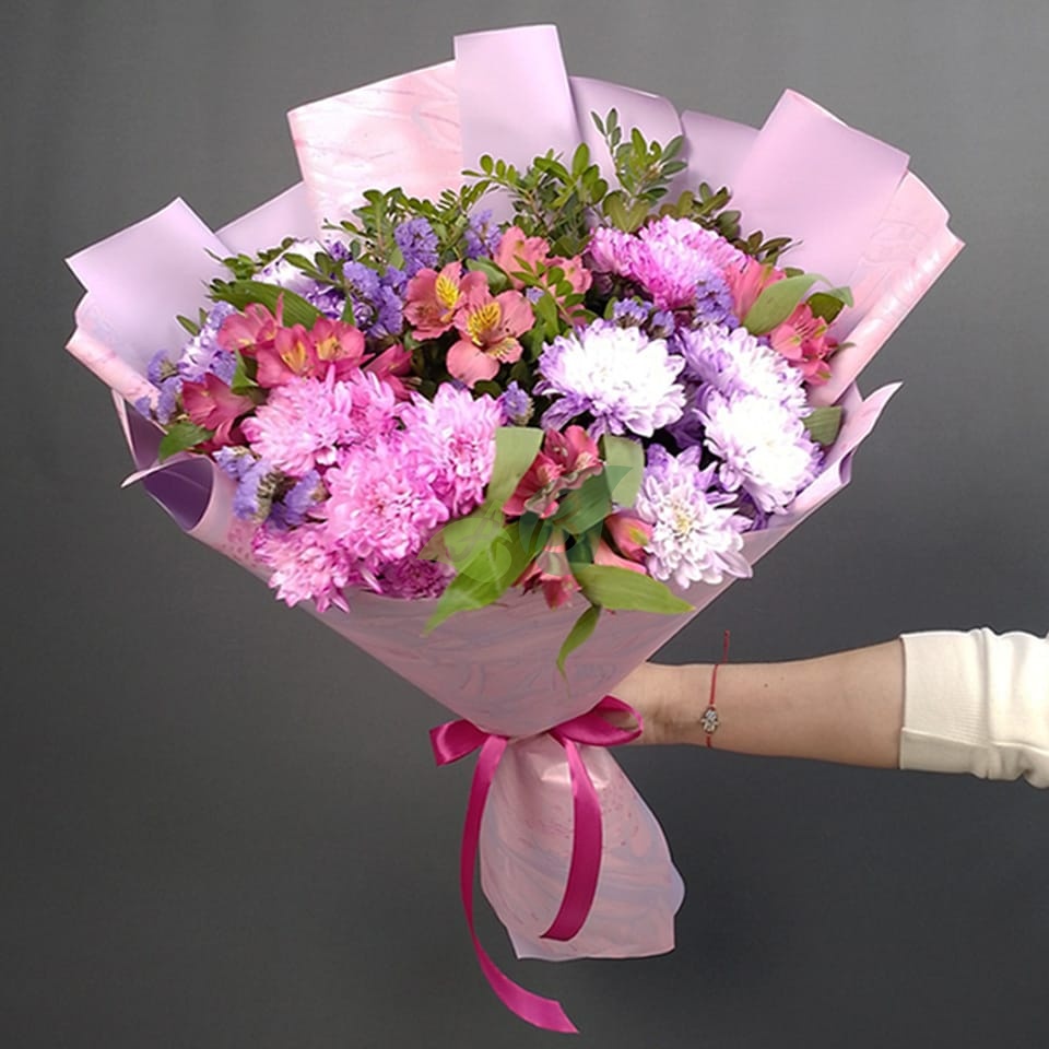 Идеальный букет цветов с доставкой – из микса хризантем и розовых альстромерий в композиции “Яркое сияние”. Сочетание сиреневого и розового цветов с малиновой герберой делают его ярким и нетривиальным.